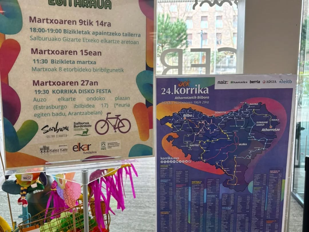 KORRIKA SALBURUANKirikahace 20 horas1 Min. de lectura🚴♀️✨Badator Korrika!🏃♀️💜🔥💚 Salburuan motorrak berotzen hasiko gara igande honetan! 🚴♂️ Bizikleta martxa batekin hasiko dugu festa, elkarrekin giroa piztuz! 🎶🌿🕜11:30, Martxoak 8 etorbideko biribilgunetik.🎨 Eta aste osoan zehar… 🚲 Bizikletak apaintzeko tailerra egingo dugu elkartze aretoan:🕜 18:00-19:00AApaindu zure bizikleta eta eman kolorea Korrikari! 🌈🟣🟢💜 Animatu eta parte hartu!Ez galdu aukera! Euskara Gara! 🗣️💪💜 ¡Ya viene la Korrika! 🏃♂️🔥En Salburua empezamos a calentar motores este domingo:🚴♀️ Marcha en bicicleta para arrancar con energía y buen ambiente 🎶🌿🕜11:30 en la rotonda de Avda 8 de Marzo🎨 Durante toda la semana además tendremos:🚲 Taller de decoración de bicis en la sala de encuentro 🕜 18:00-19:00¡Decora tú bici para la Korrika! 🌈✨💜 Anímate y participa!¡No te lo pierdas! 🙌🚴♂️Euskara Gara!
